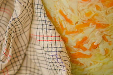 Traditional rustic winter food. Fermented cabbage sauerkraut with carrot. Ready to eat