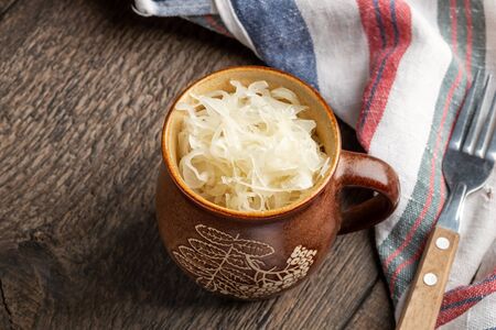 Fermented cabbage or sauerkraut in a brown clay pot, top view