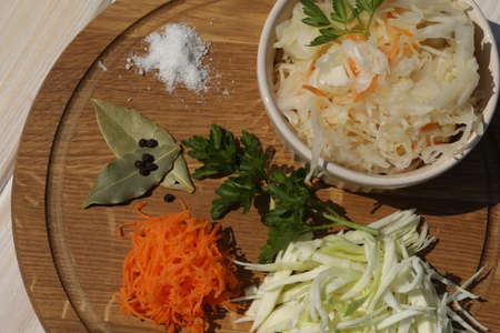 Homemade sauerkraut on a wooden plate. Fermented cabbage with carrot on a light background. Eco food, the trend of healthy eating. Place for your text.