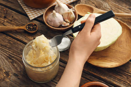 Woman preparing tasty sauerkraut at kitchen table, closeup