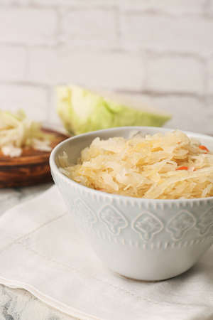 Fresh pickled cabbage in white bowl. healthy winter food.