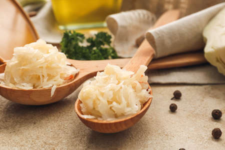 Spoons with tasty sauerkraut on grunge background, closeup