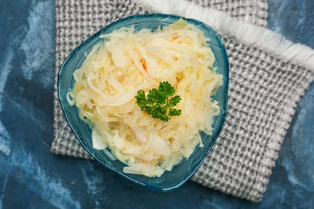 Sauerkraut in a blue bowl on a wooden table
