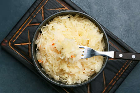 Bowl with tasty sauerkraut on dark background
