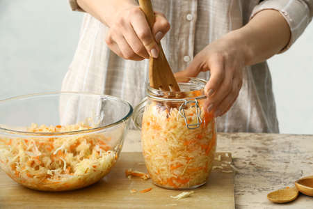 Woman putting tasty sauerkraut into glass jar on table in kitchen, closeup