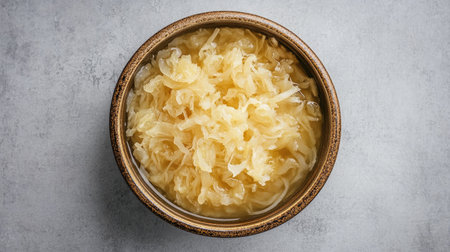 A rustic ceramic bowl filled with fresh fermented sauerkraut sits on a gray surface, showcasing its unique texture and tangy flavor, perfect for culinary enthusiasts.