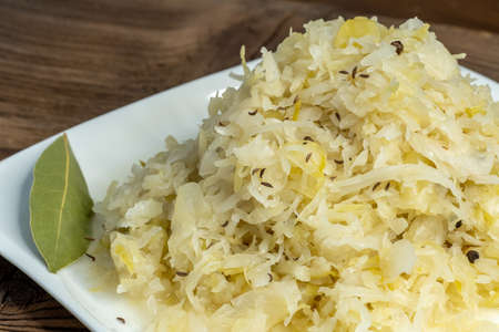 Homemade pickled sauerkraut on a white plate