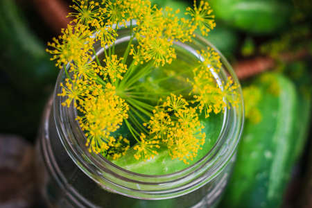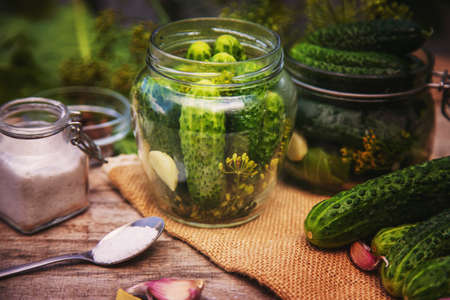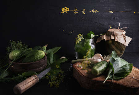 Preparing for pickling and preserving cucumbers in a jar on an old wooden table in the garden. Summer, sunny day. Cucumbers, herbs, dill, garlic. country style.