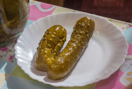 Pickles whole on a white plate on the table