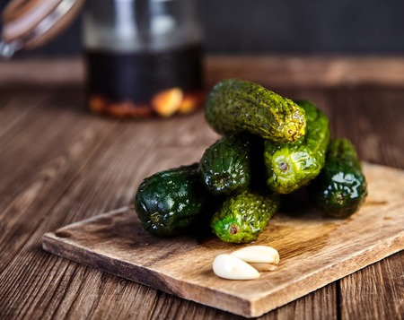 Pile of pickled cucumbers in soy sauce and rice vinegar on cutting board on wooden table, cloves of garlic near it. Jar with the marinade behind. Chinese recipe. Shallow depth of field, closeup shot