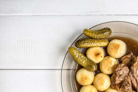 Stewed turkey meat served with silesian dumplings and sauce. Top view