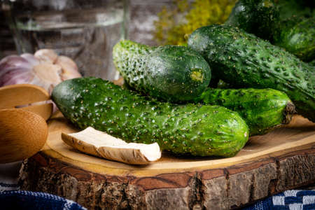 Cucumbers on a wooden surface, preparation for canning