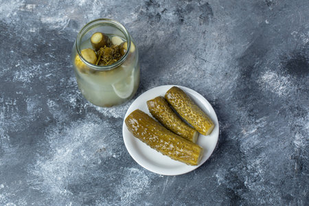 Cucumbers pickled in a glass jar on a marble background