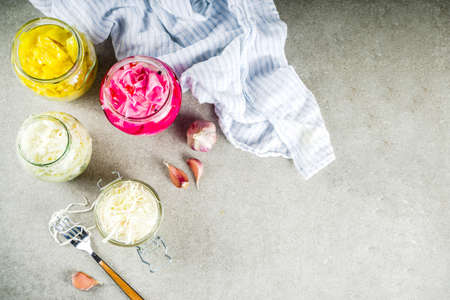 Fermented preserved vegetarian food, Various Sauerkraut preserving in glass jars. Three types homemade Sauerkraut on grey stone table. Copy space.