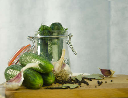 Fresh cucumbers, garlic and herbs. The process of preserving cucumbers.