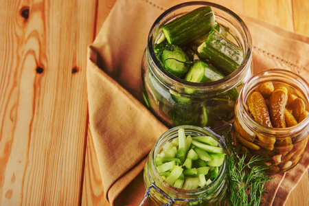 Canned pickled cucumbers in jars closeup, homemade pickles, canning food, marinated cucumbers, canning vegetables selective, focus, generative ai illustration