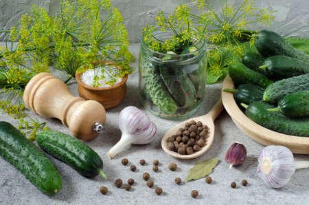 Preparation for pickling cucumbers with spices and herbs on light stone table.