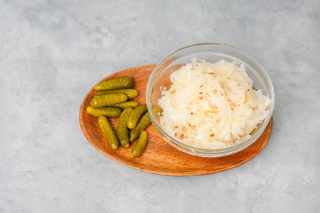 Sauerkraut and pickled cucumbers on neutral background, top view