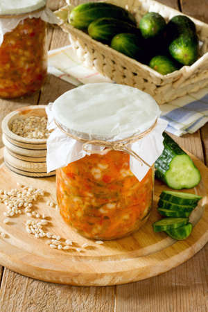 preserves pearl barley, cucumber, pickle in the bank on a wooden background