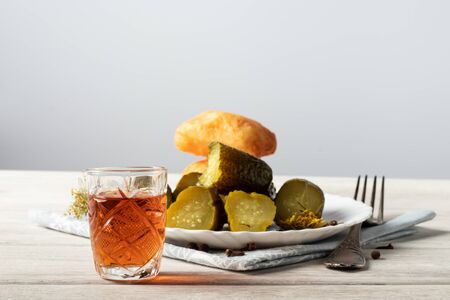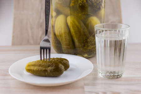 national trait harmful to health: a large jar of pickles and faceted glass of Russian vodka on a white table, a couple of cucumbers laying on the plate, a fork sticking in it