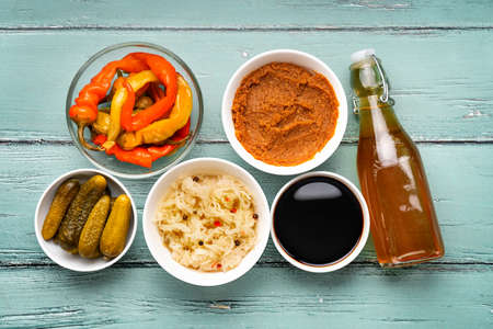 Top view on fermented foods on turquoise background. Healthy food concept for strong immunity and intestine