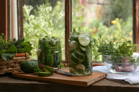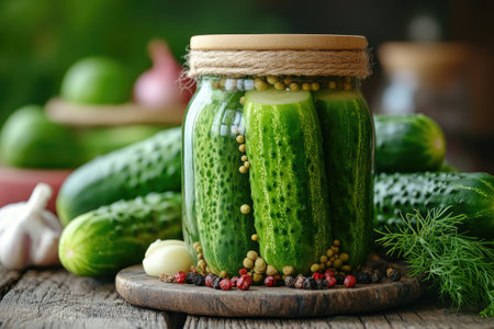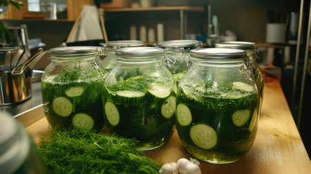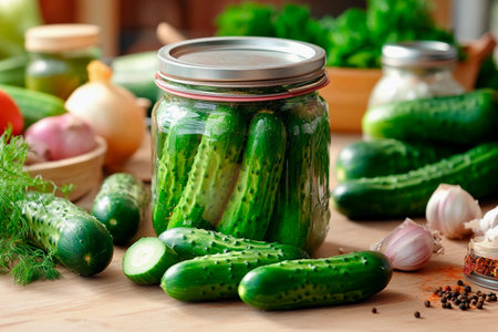 Bright green cucumbers are carefully packed in a glass jar, surrounded by various fresh vegetables and herbs. The scene captures the essence of home-cooking and the joy of preserving tasty flavors.