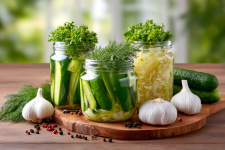 Glass jars filled with pickled cucumbers and sauerkraut on a wooden table