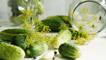 Fresh cucumbers ready for canning and pickling with dill, garlic and spices on a wooden table and in glass jars. Copy spase