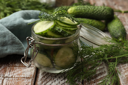 Glass jar filled with freshly pickled cucumbers and spices standing on rustic wooden table