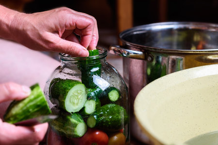 Preservation of seasonal vegetables. Woman putting washed cucumbers in a glass jar