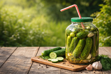 A jar of pickled cucumbers and a straw on the table. Space for text