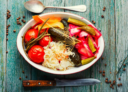 Fermented preserved vegetables. Fermented preserved vegetarian and pickled food concept