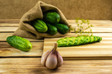 Garlic on a wooden background, near a cutting board with chopped slices of cucumber, a bag of cucumbers and dill