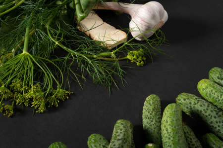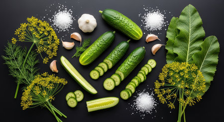 Fresh dill, cucumbers, and garlic arrangement with salt and leaves on black background