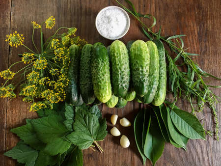 Cucumber pickle set. cucumbers, dill umbel, tarragon, garlic cloves, cherry and black currant leaves and salt isolated on wooden background