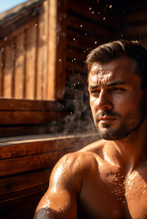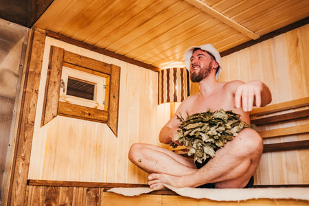 Russian bathhouse. Young man relaxing and sweating in wooden sauna with hot steam. Guy with bath besom resting on bench in spa complex. Wellness, self care, healthy concept. Copy text space
