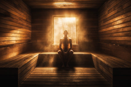 A serene scene of a person meditating in a warm, dimly lit sauna, surrounded by steam