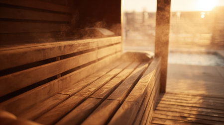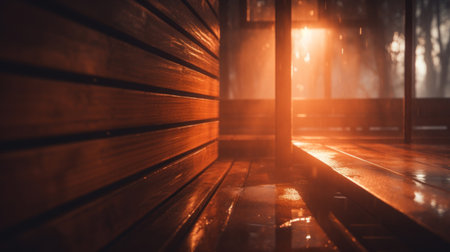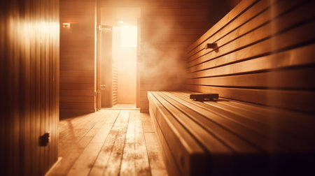 Golden light illuminating steam filling a relaxing sauna room with nobody inside