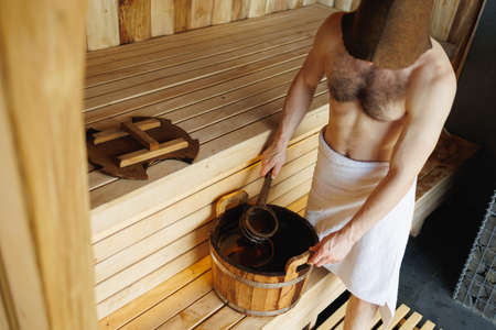 Man scooping water from wooden bucket in sauna. Male resting in a steam room