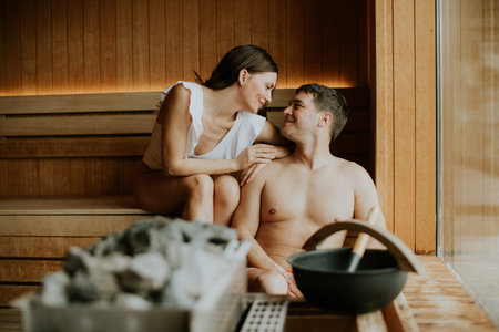 Two people sit closely in a wood sauna. They share smiles and looks while relaxing. The atmosphere is warm with wood walls and a view of stones beside them.