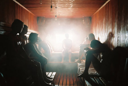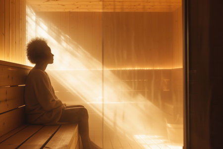 A person sits calmly in a sauna, sweating heavily while enjoying the warmth and promoting relaxation and detoxification.