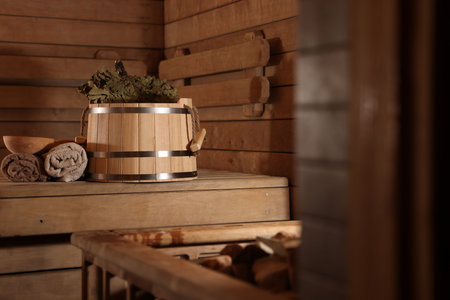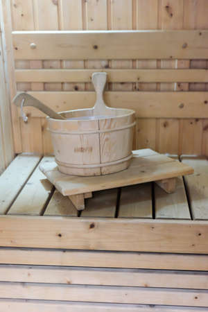Vennik and wooden bucket in the sauna. Wooden bucket in the interiors of the bath. Sauna room with traditional sauna accessories for healthy.