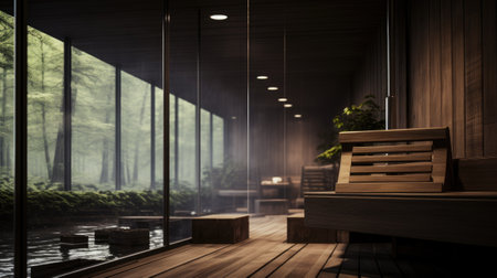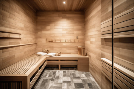 Interior of a wooden sauna in hotel spa and wellness center : Generative AI