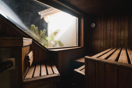 Cozy Wooden Sauna Interior with Natural Light and Greenery View