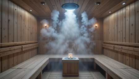A tranquil spa sauna with wooden benches and soft lighting, providing a calming retreat for guests to detoxify and unwind.