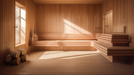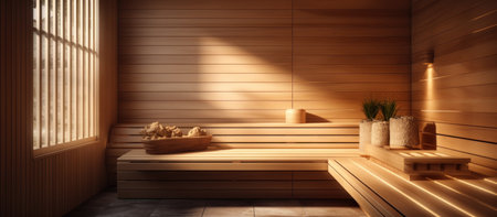 Experience Scandinavian wooden sauna interior. Find bench seats create a relaxing and wellness atmosphere. Discover spa retreat with natural wood textures and soft lighting. Interior design promotes serenity and warmth. AI Generative AI generated
