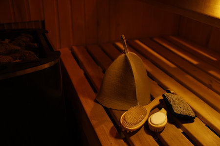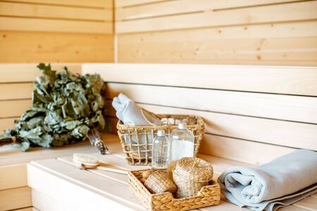 Accessories for resting in the sauna. Broom, towes, brush and some cosmetics on the wooden bench