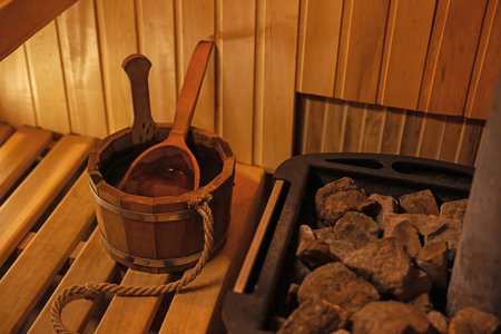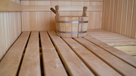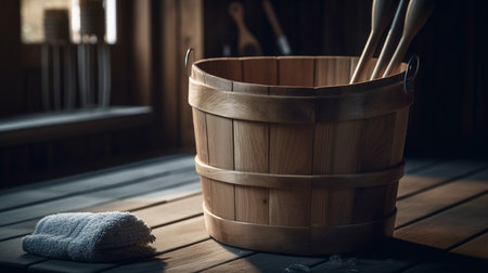 wooden bucket and ladle in a traditional sauna in a winter setting, created with generative ai