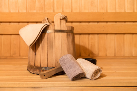 Bucket, whisk, ladle and towels on wooden bench in sauna