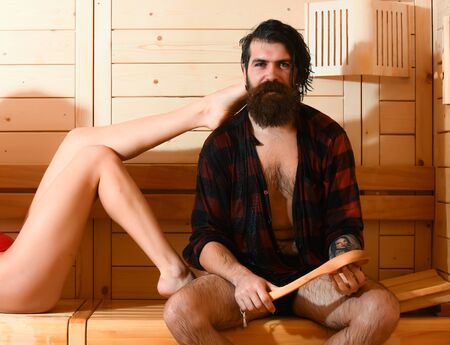 Handsome man or bather, bearded hipster with beard and moustache in red checkered shirt and sexy female legs wet of water in sauna, thermal bath on wooden background